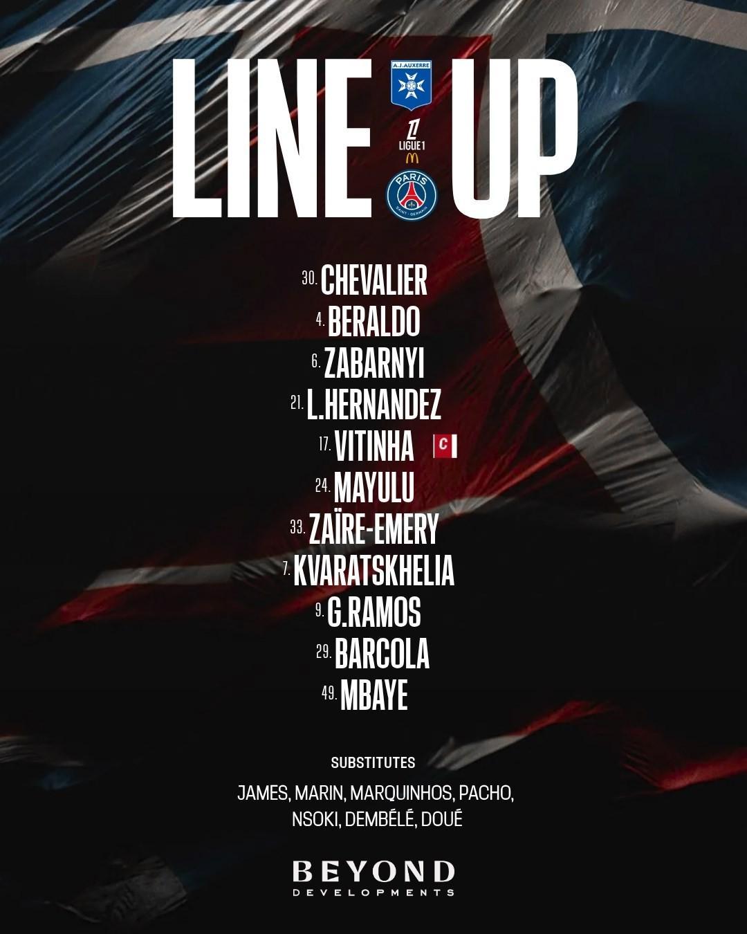 巴黎首发:30-舍瓦利耶、4-贝拉尔多、6-扎巴尔尼、21-卢卡斯-埃尔南德斯、17-维蒂尼亚、24-马尤卢、33-扎伊尔-埃梅里、7-克瓦拉茨赫利亚、29-巴尔科拉、49-姆巴耶、9-贡萨洛-拉莫斯