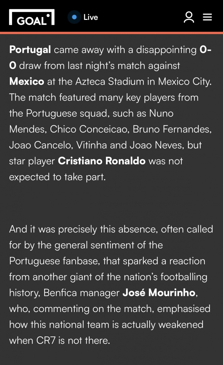 03月30日讯 包括进球网、拜因体育报道,穆里尼奥称C罗不在时葡萄牙就是普通球队,对手不怕你。之后相关采访内容经过大面积转载,引发热议。